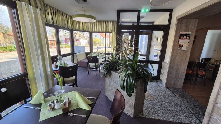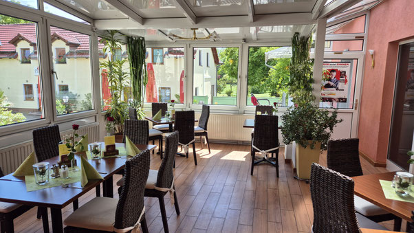 Gastraum zwischen Theke und Wintergarten