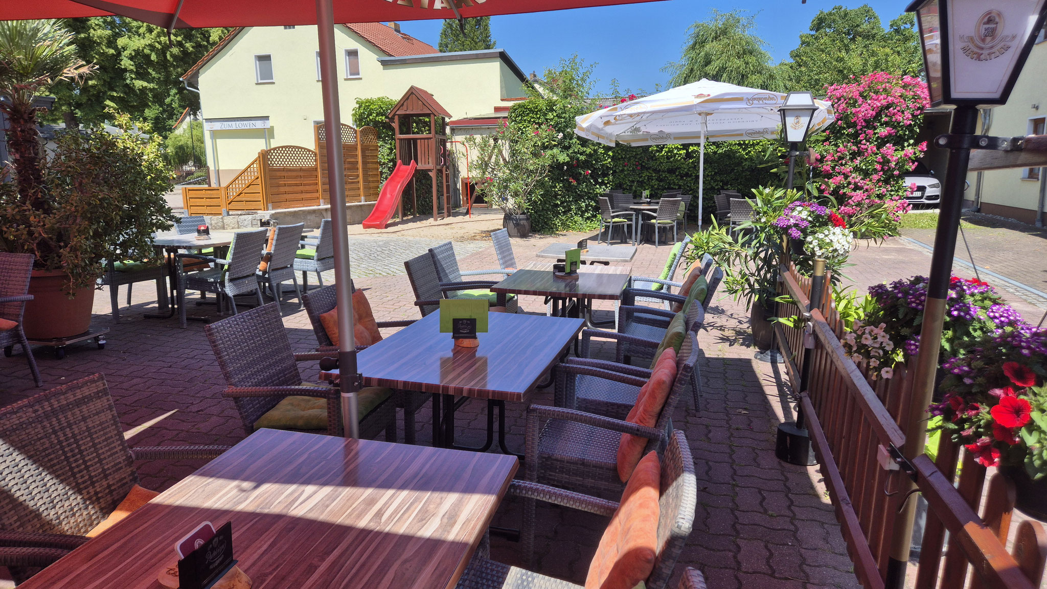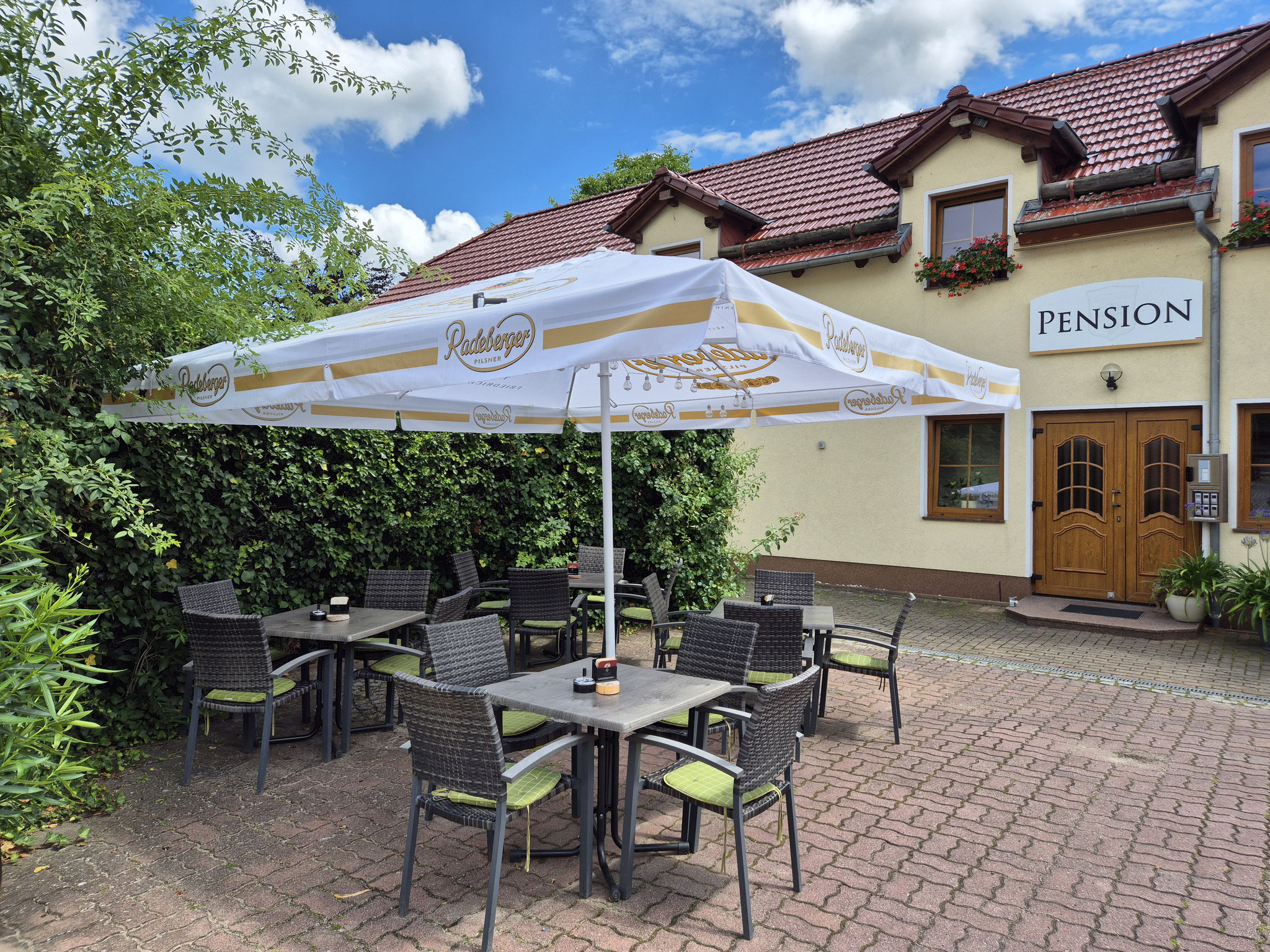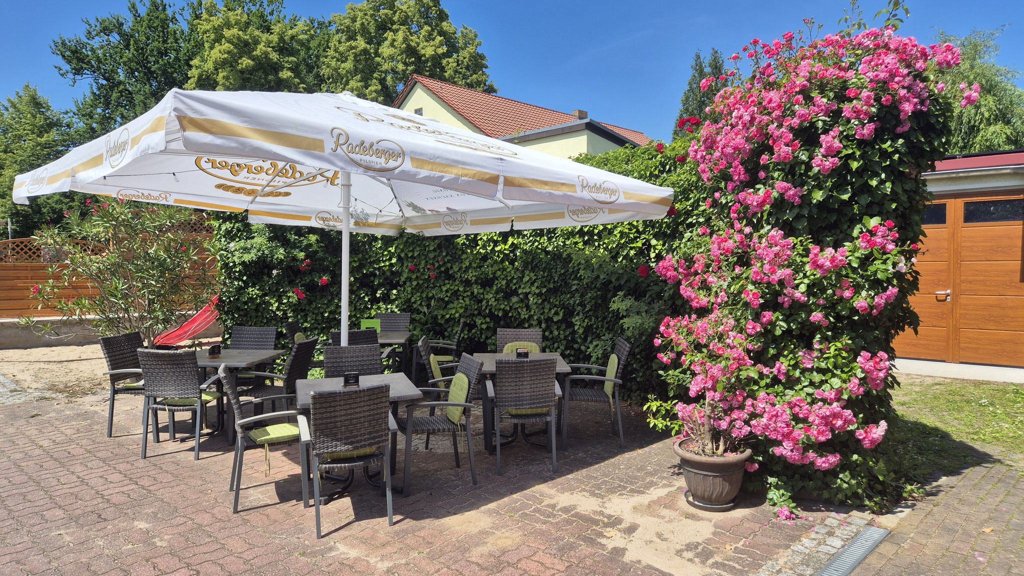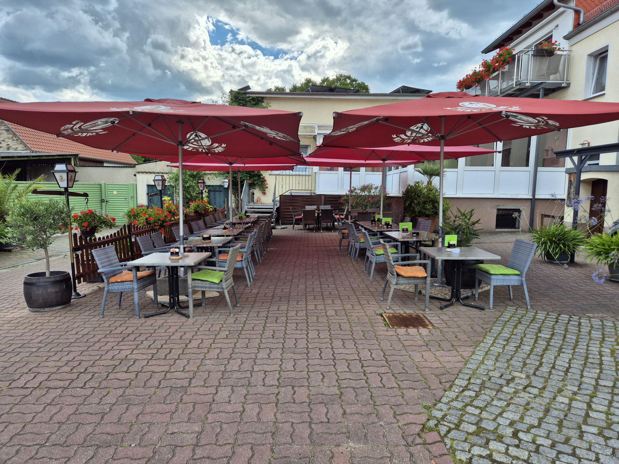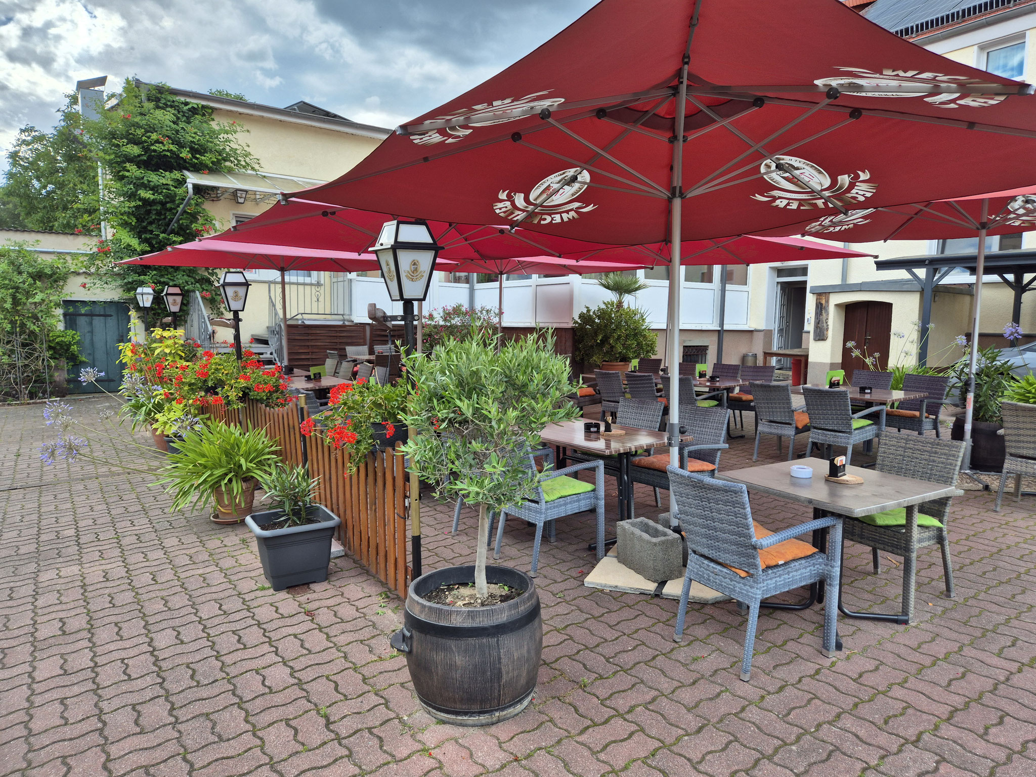 Schöner ländlicher Biergarten auf dem Hof, begrünt mit vielen